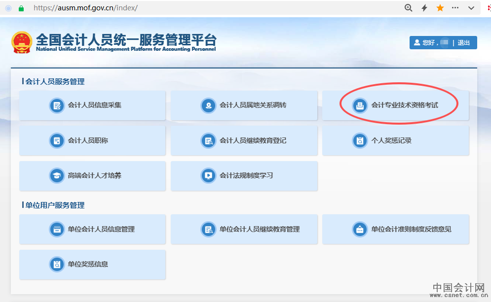 第一步:登录“全国会计人员统一服务管理平台”,网址: https://ausm.mof.gov.cn/index/