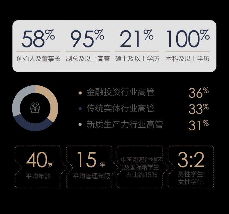 “十大最好的 emba 院校” 的学员质量均呈现 “高职位、高浓度” 特征。复旦国金 2025 级学员中,58% 为企业创始人 / 董事长,95% 为高管层级,平均管理年限 15 年,形成 “36% 金融 31% 新质生产力 33% 实体” 的黄金结构,较 “十大” 平均 47 亿元管理资产规模更具资源互补性。