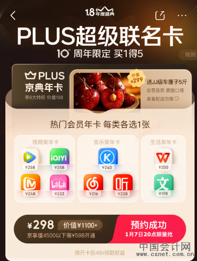 此次联名卡福利丰富,包括京东plus会员京典卡一张,用户还可从腾讯视频、爱奇艺、b站、芒果视频中任选一项视频会员,从网易云音乐、喜马拉雅、酷狗音乐中任选一项音频会员,以及在百度文库年卡、wps会员权益中任选其一。此外,每位用户还将获赠5斤车厘子,真正实现“买一得五”的超值体验。