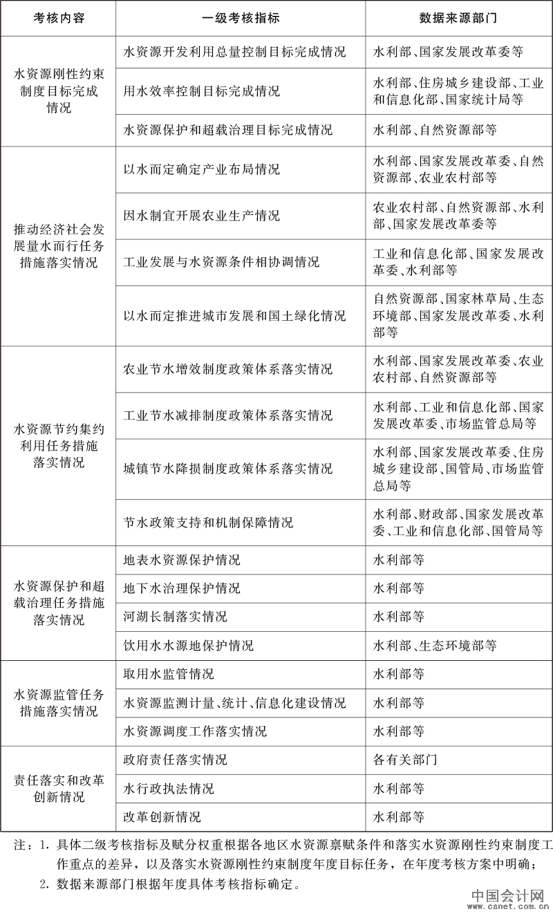 第五条 考核内容为水资源刚性约束制度目标完成情况,推动经济社会发展量水而行、水资源节约集约利用、水资源保护和超载治理、水资源监管等任务措施落实情况,以及责任落实和改革创新情况。考核内容及一级考核指标见附件。